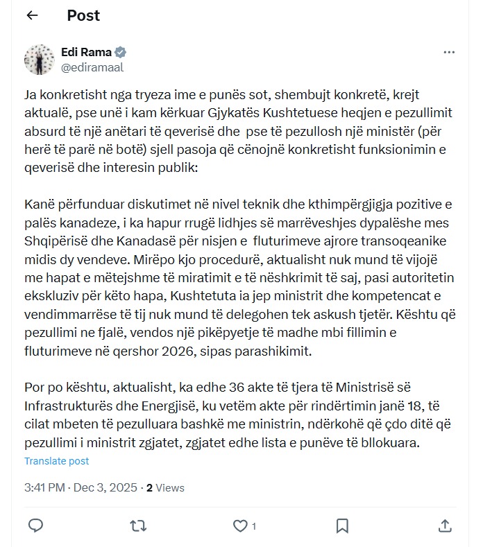 Kryeministri Edi Rama, ka reaguar sërish në lidhje me pezullimin nga detyra me vendim të GJKKO-së të zv.kryeministres dhe ministres së Infrastrukturës Belinda Balluku, vendim të cilin ai e ka ankimuar në Gjykatë Kushtetuese.