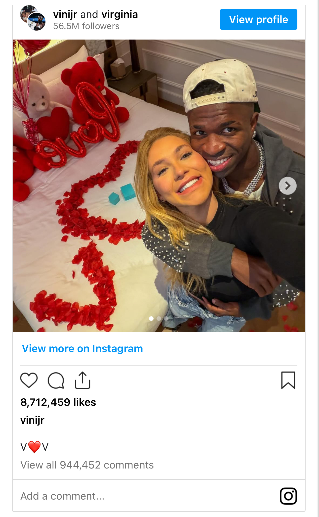 Publikimi po ashtu i dha fund zërave se futbollisti po shmangte ta bënte publike lidhjen, thashetheme që u përforcuan pas një episodi të komentuar gjerësisht, kur Vini Jr. mbuloi fytyrën me një pecetë gjatë pozimit për një foto pranë Virginias, ish-bashkëshortes së këngëtarit Zé Felipe.