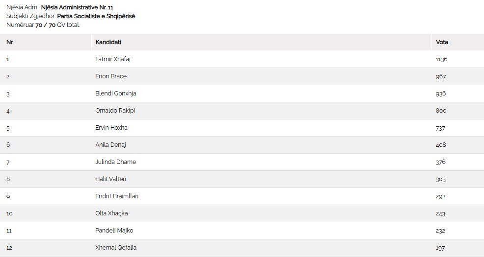 Fatmir Xhafaj, u rendit i pari në njësitë 10 dhe 11, ndërsa Erion Braçe fitoi njësitë 5 dhe 9.