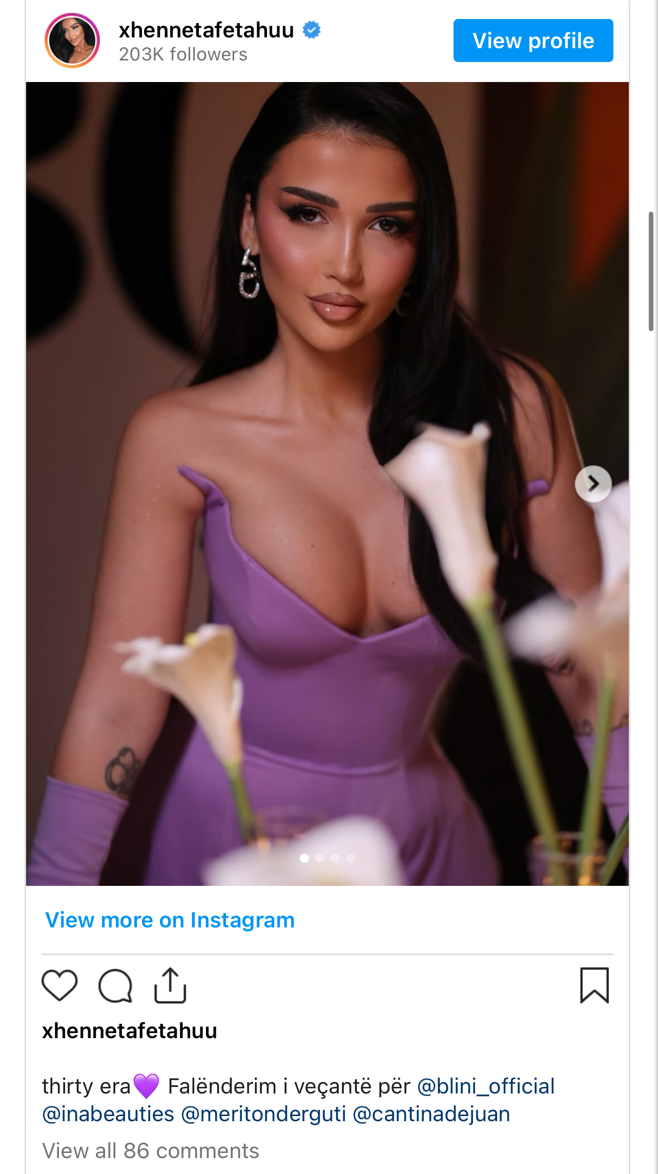 Në pamjet e publikuara në rrjetet sociale, Xheneta ka tërhequr vëmendjen me paraqitjen e saj, duke shkëlqyer me një fustan të shkurtër në ngjyrë vjollcë.