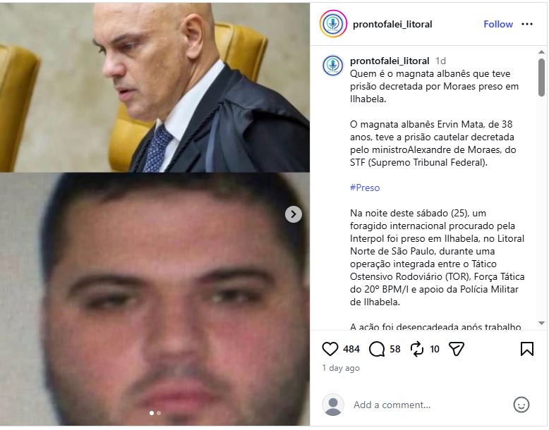 Një tjetër detaj me rëndësi, ka qenë se urdhër-arresti për Ervin Matën u lëshua nga gjykatësi ministri Alexandre de Moraes i Gjykatës së Lartë Federale (STF) në shtator të vitit të kaluar (foto poshtë).