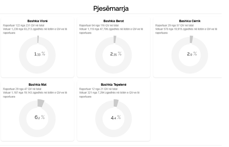 Konkretisht, në bashkinë e Vlorës deri në orën 9:30 pjesëmarrja në votim është 1.33 %, në bashkinë e Beratit pjesëmarrja është 2.35%, në bashkinë e Cërrikut 2.9%, në Mat 6.2 % dhe në bashkinë e Tepelenës pjesëmarrja është 4.4%.