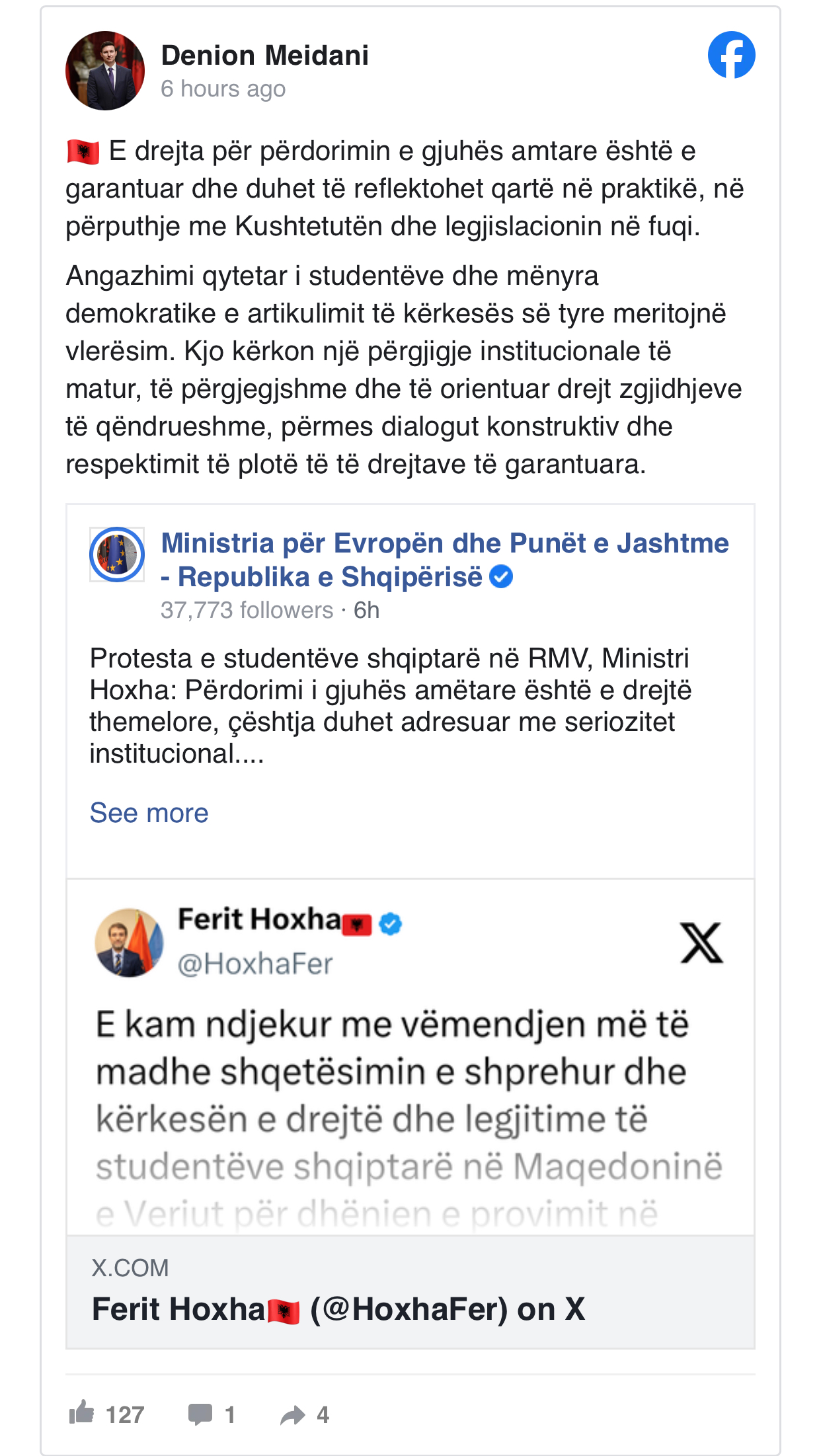 Ambasadori i Republikës së Shqipërisë, Denion Meidani ka rikonfirmuar mbështetjen për studentët shqiptarë që protestuan sot, duke nënvizuar se e drejta për përdorimin e gjuhës amtare është e garantuar dhe duhet të reflektohet në përputhje me Kushtetutën dhe legjislacionin në fuqi.