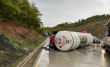 FOTOLAJM/ Aksident në Përrenjas, autoboti përmbyset dhe zë rrugën