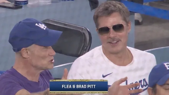 Veshur me fanellën e bardhë të ekipit Dodgers, aktori pozoi me mikun e tij të vjetër, basistin e grupit legjendar Red Hot Chili Peppers, Flea.