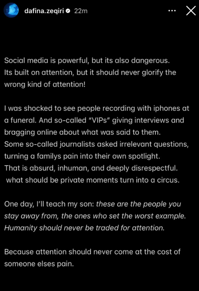 Këngëtarja e njohur Dafina Zeqiri ka reaguar përmes një postimi në rrjete sociale, ku ka kritikuar ashpër sjelljen e disa personave në funeralin e vëllait të Gjestit.