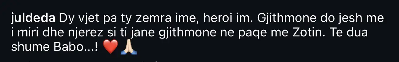 “Dy vjet pa ty zemra ime, heroi im. Gjithmonë do jesh më i miri dhe njerëz si ti janë gjithmonë në paqe me Zotin. Të dua shumë, Babo…”, – shkruan ai, duke shprehur mallin e thellë për figurën më të rëndësishme të jetës së tij.