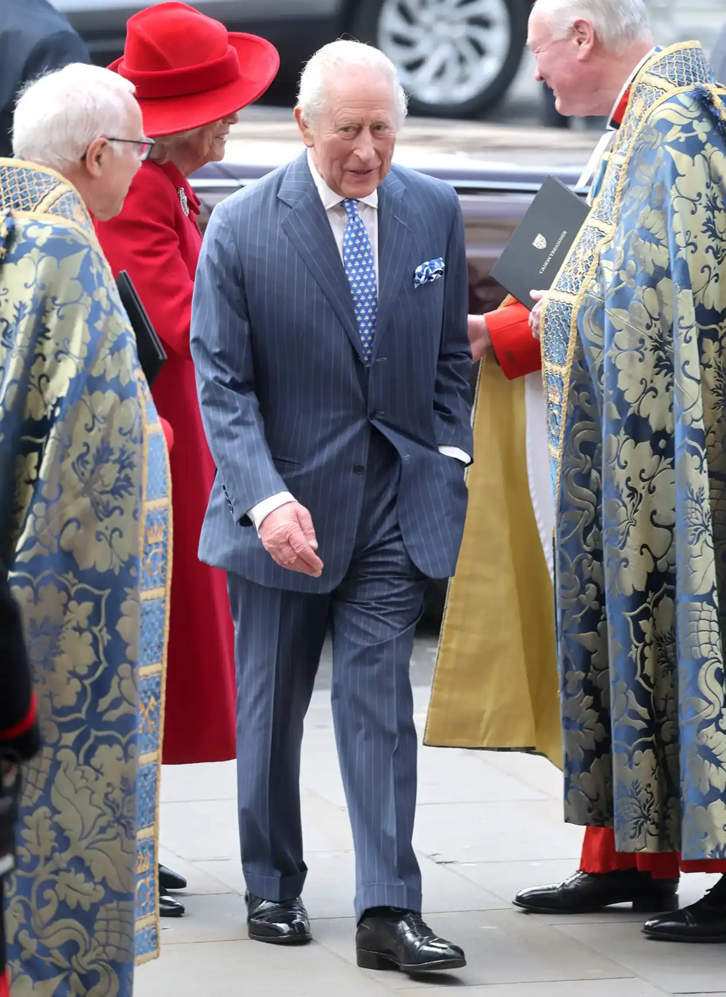 Princi dhe Princesha e Uellsit mbërritën të veshur me nuanca të koordinuara blu, me Kate që kishte zgjedhur një pallto elegante nga Catherine Walker dhe një kapelë të së njëjtës ngjyrë. Në ceremoni morën pjesë edhe Mbretëresha Camilla, Princesha Anne me bashkëshortin e saj Sir Tim Laurence, si dhe Duka dhe Dukesha e Gloucester.