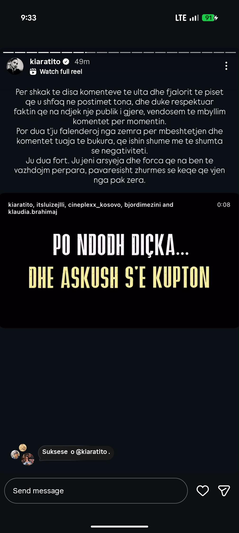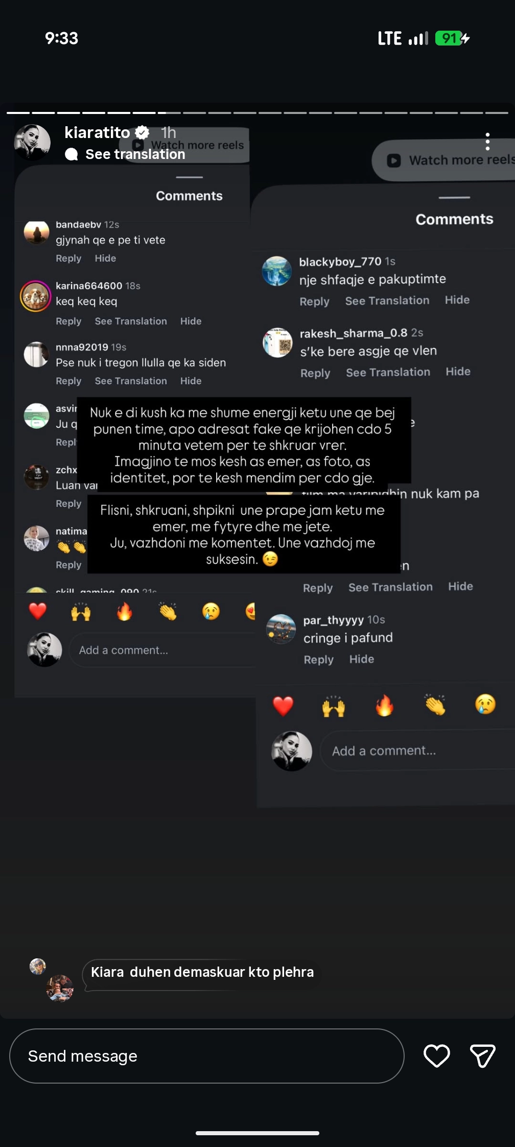 Kiara nuk e la me kaq, por vendosi të “demaskojë” publikisht atë që ajo e quan një sulm të orkestruar. Ajo publikoi disa ‘screenshot’-e të komenteve negative (si “keq keq”, “cringe”, “shfaqje e pakuptimtë”), të cilat vinin kryesisht nga profile pa foto ose me emra të huaj e të dyshimtë.