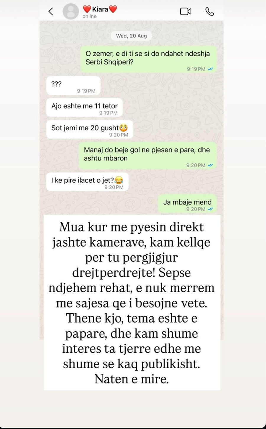 Natën e mirë”, shkroi Luizi teksa publikoi një screenshot të një bisede të vjetër me Kiarën, por që nuk kishte lidhje aspak me situatën.