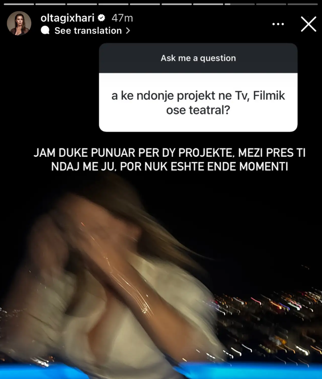 Aktorja dhe ish banorja e ‘Big Brother VIP Albania’, Olta Gixhari ka zbuluar përmes një sesioni pyetje-përgjigje në Instagram se po përgatitet për rikthimin në ekran, por pa dhënë shumë detaje. Një ndjekës e pyeti nëse ka ndonjë projekt në televizion, film apo teatër, dhe përgjigjja e saj la të kuptohet se surprizat janë afër.