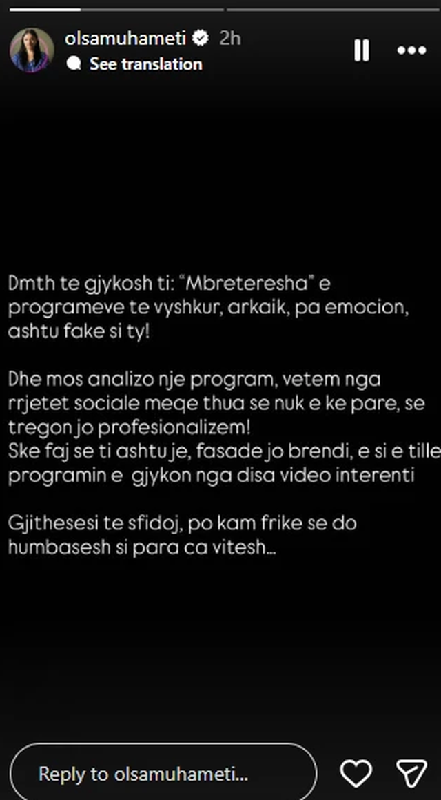 Ky reagim ka ndezur edhe më shumë debatin mes figurave publike dhe ka shkaktuar diskutime të shumta në rrjet, pasi shihet si një përplasje e hapur mes dy emrave të njohur të televizionit”.