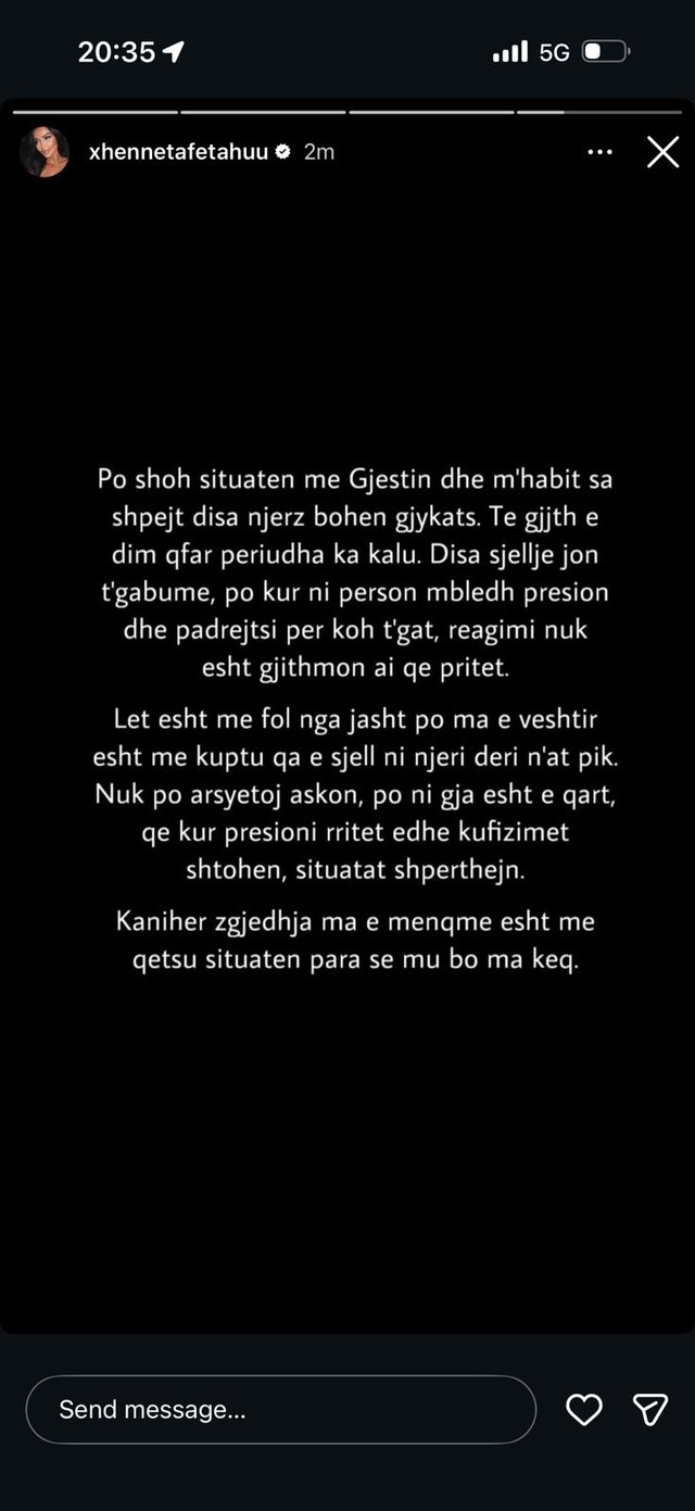 Përmes një postimi në Instagram, Xheneta ka kërkuar më shumë mirëkuptim nga publiku, duke theksuar se nuk po përpiqet të justifikojë asnjë sjellje të gabuar, por se presioni i gjatë dhe grumbullimi i padrejtësive mund të çojnë në reagime të papritura.