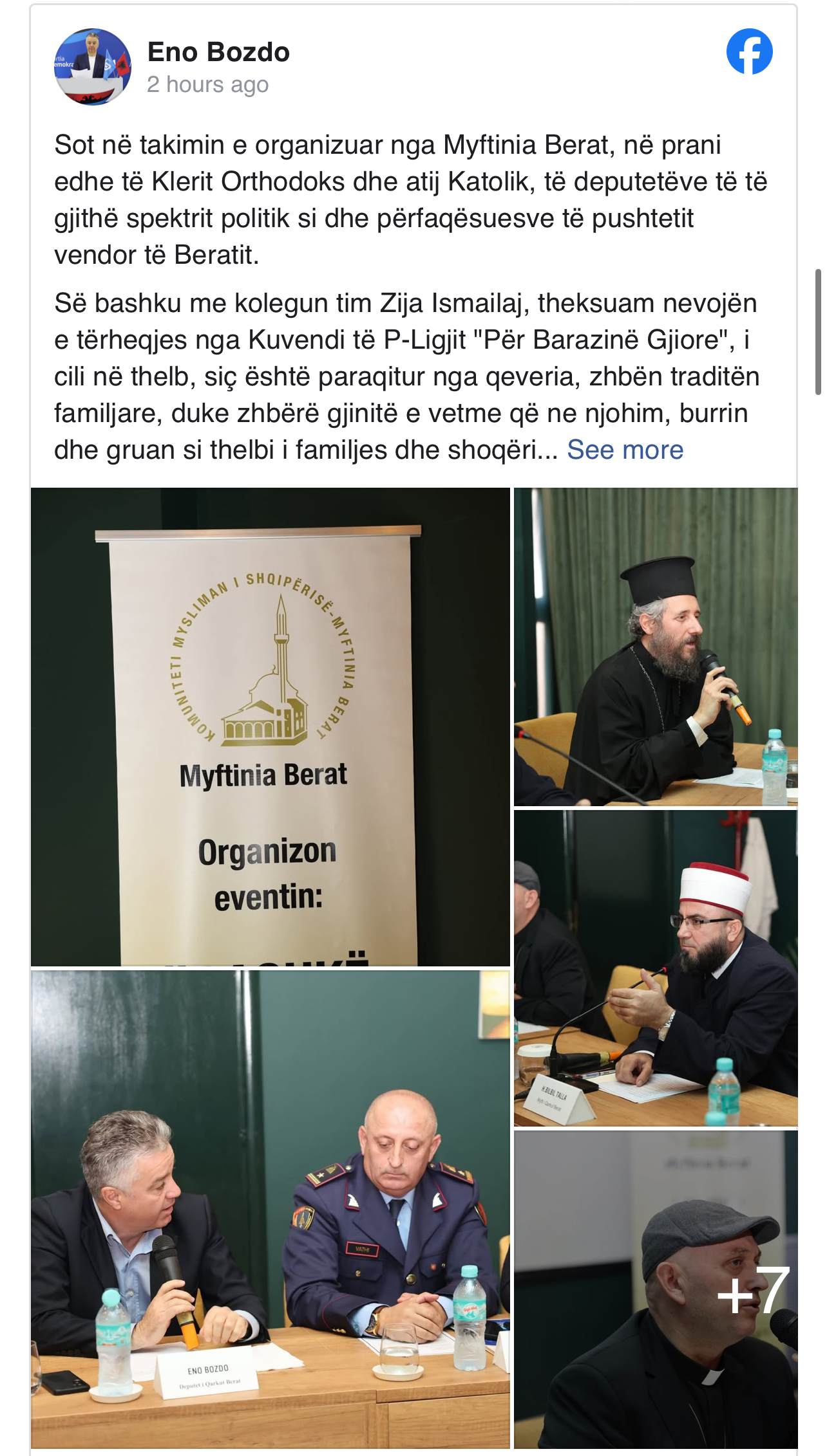 Deputeti i PD, Enno Bozdo mori sot pjesë së bashku me disa deputetë të forcave të tjera politike në qarkun e Beratit, në një tryezë të organizuar nga Myftinia Berat.