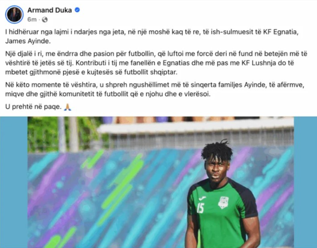 Në këto momente të vështira, u shpreh ngushëllimet më të sinqerta familjes Ayinde, të afërmve, miqve dhe gjithë komunitetit të futbollit që e njohu dhe e vlerësoi.