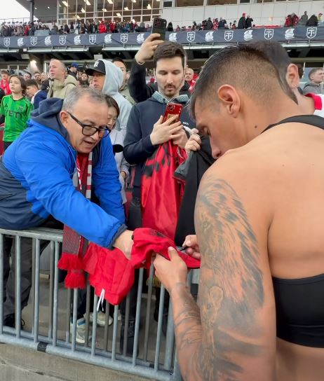 Një prej tyre kishte veshur fanellën e Kombëtares, si dhe një kapele me flamurin shqiptar. Një tjetri i firmosi fanellën e Shqipërisë dhe flamurin kuqezi.