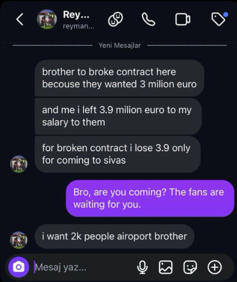 Më pas, ai vazhdon bashkëbisedimin e tij me një kërkesë specifike pas kthimit te Sivaspor. “Dua 2 mijë njerëz në aeroport”, shkruhet në këtë bashkëbisedim që aludohet se është bërë mes tifozit të klubit turk dhe Manajt.