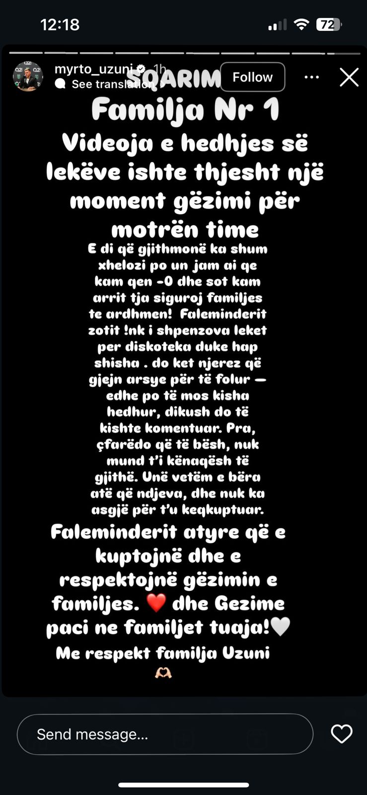 Faleminderit atyre që e kuptojnë dhe respektojnë gëzimin e familjes! Gëzimë paçi në familjet tuaja! Me respekt, familja Uzuni”.