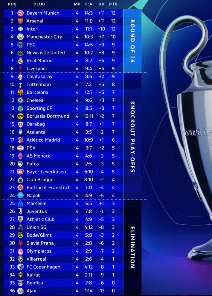 Ndeshjet e katërta të Ligës së Kampioneve janë mbyllur sot dhe tabela e klasifikimit jep një imazh të qartë të pretendimeve që ka secila skuadër për të vazhduat me tej në turne.