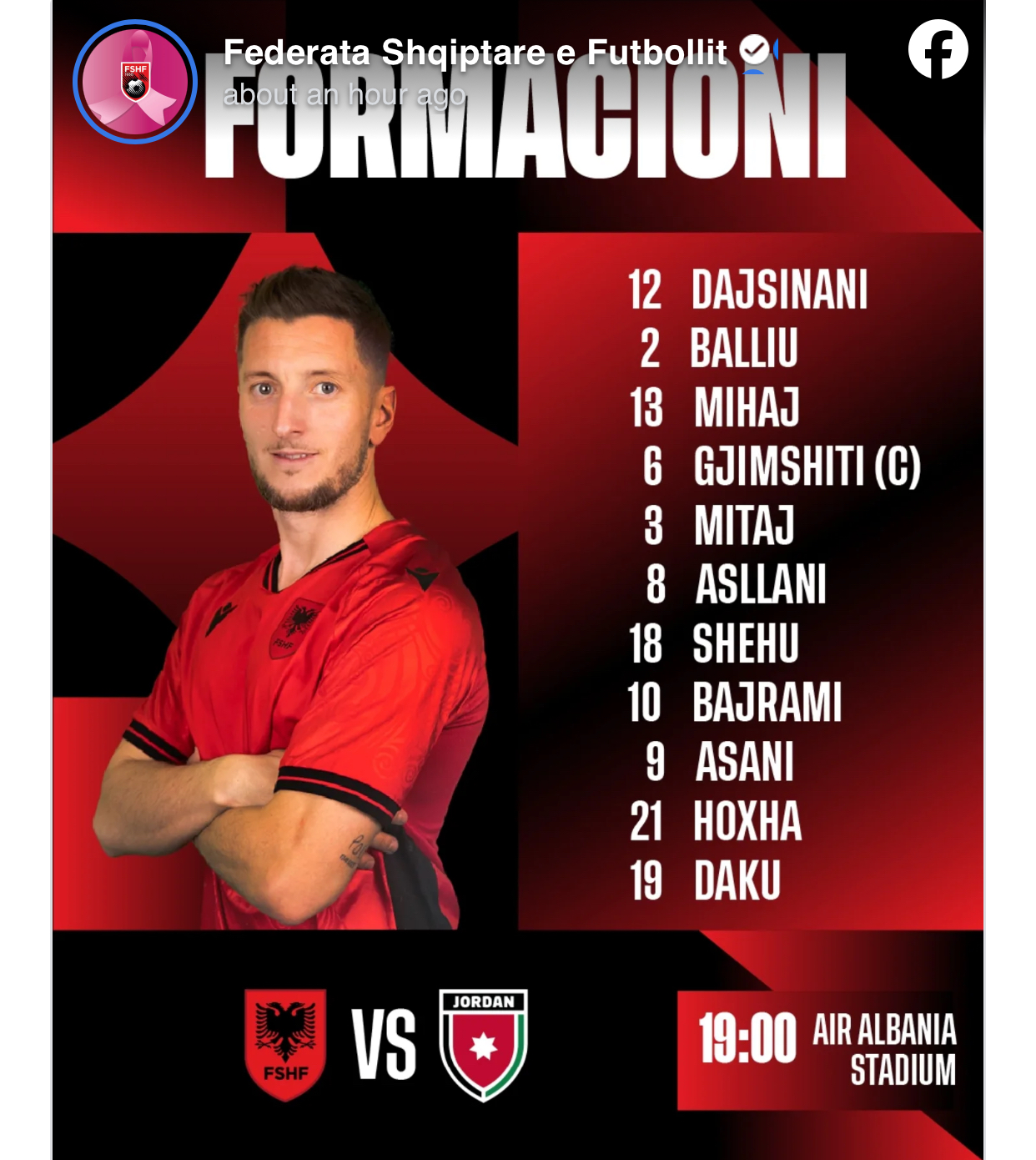 Kombëtarja shqiptare do të zhvillojë sot ndeshjen miqësore ndaj Jordanisë, në orën 19:00 në stadiumin “Air Albania”.