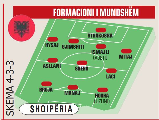 Kështu, Strakosha është në portë, i ndihmuar në mbrojtje nga Hysaj në të djathë e Mitaj në të majtë. Në qendër do të jetë Gjimshiti, ndërkohë që balotazh ka mes Ajetit e Ismajlit, me këtë të fundit më të avantazhuar.Në mesfushë, Shehu, Asllani dhe Laçi do të jenë në ndihmë të 3 sulmuesve.